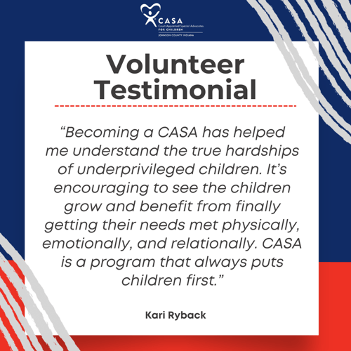 “Becoming a CASA has helped me understand the true hardships of underprivileged children,” says Kari Ryback. “It’s encouraging to see the children grow and benefit from finally getting their needs met physically, emotionally, and relationally.”