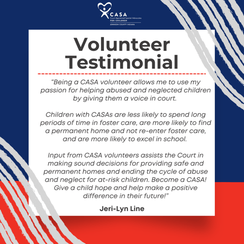 As CASA volunteer Jeri-Lyn Line shares, “Children with CASAs are less likely to spend long periods of time in foster care, are more likely to find a permanent home and not re-enter foster care, and are more likely to excel in school.” This kind of long-term success benefits more than just the child—it strengthens entire families and communities by reducing future interactions with the court and welfare systems.