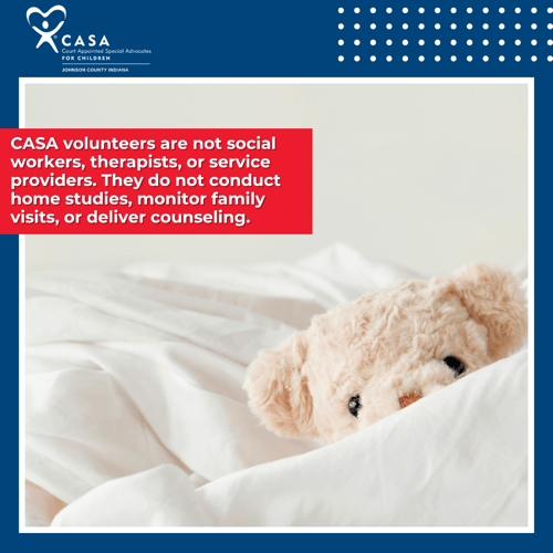 At CASA of Johnson County, Indiana, our volunteers serve a very specific and essential role within the child welfare system: to advocate for the best interests of children who have experienced abuse or neglect. But to fully understand what CASA volunteers do, it’s equally important to understand what they don’t do.